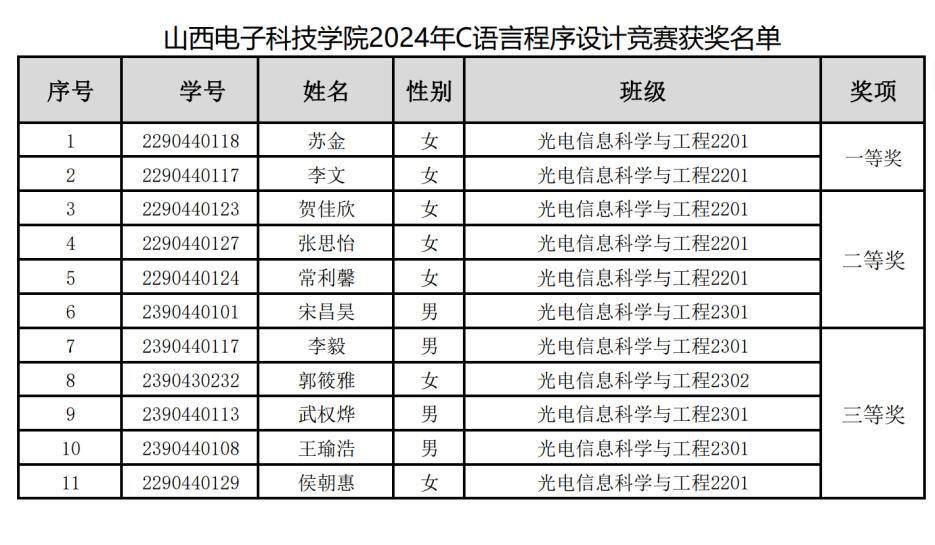 近日,由tyc41183太阳成集团教务部组织,信创产业学院承办的tyc41183太阳成集团2024年C语言程序设计竞赛大赛获奖名单揭晓。经过预赛和决赛两轮筛选,根据既定的竞赛规则和评判标准,我院光电信息科学与工程专业11名同学斩获佳绩。获得一等奖的有苏金和李文,获得二等奖的有贺佳欣、张思怡、常利馨、宋昌昊,获得三等奖的有李毅、武权烨、王瑜浩、郭筱雅、侯朝惠。祝贺光电信息科学与工程专业的同学们获此佳绩,希望同学们能再接再厉,不断突破自我,再创新的辉煌。