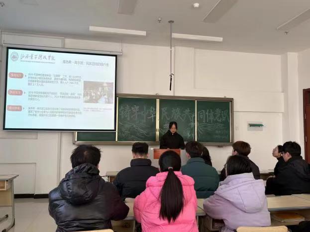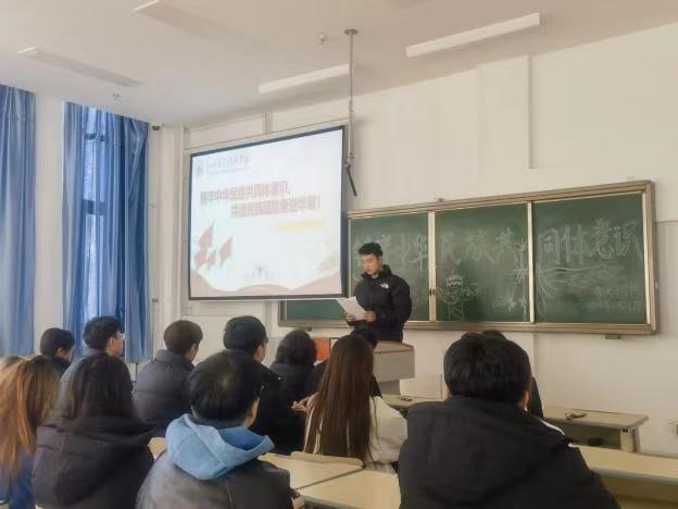 随后,由两位同学进行了一场精彩纷呈的主题宣讲。万凯佳同学讲述了一位来自维吾尔族的民族团结的践行者库热希·库尔班。他为促进各民族交往交流交融做出了积极贡献,生动展现了民族团结的力量与温暖,诠释了民族团结一家亲的深刻内涵。王瑜浩同学围绕“铸牢中华民族共同体意识”这一主题,从历史维度出发,回顾了中华民族多元一体的发展历程,使大家深刻认识铸牢中华民族共同体意识的重要性,进一步激发了大家增进各民族之间交往交流交融、不断构筑中华民族共有精神家园的思想自觉和行动自觉。